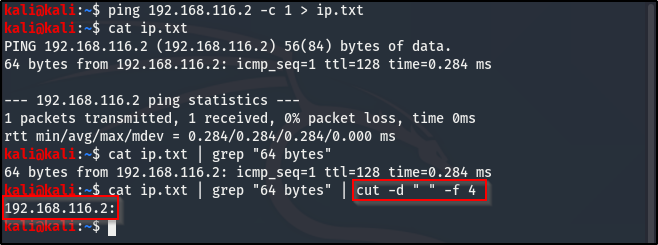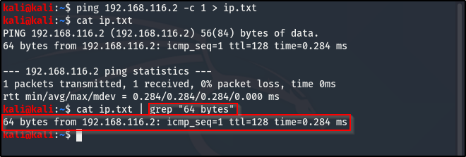 If we have multiple IP address to ping, that would be a lot of results, and we want to narrow it down to the IP of the machine that responded, grep helps with that. grep is going to grab any line with what you specify and since we’ve established that a valid ping gives back 64 bytes, that is what we definitely need to specify. like in the image below: