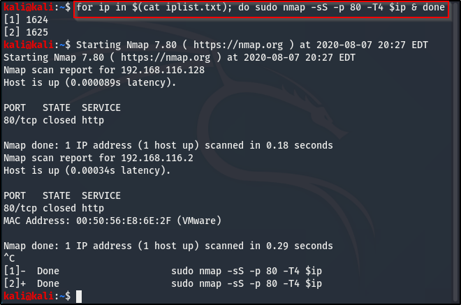Explanation: for the list of IP addresses in the iplist.txt file, do and nmap scan, still scan on port 80 and a speed of T4, $ip declares the IP address. The & lets it run multiple at one, as opposed to using the ; which lets it run one at a time, then done.